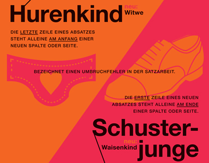 Nein, wir haben uns nicht im Ton vergriffen – Hurenkind und Schusterjunge sind typografische Satzfehler, die wir auf diesem Typo-Plakat behandeln.Hier das Plakat herunterladen